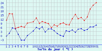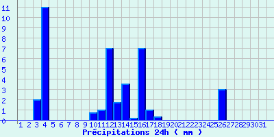 | Statistiques du mois | | Jours de fortes chaleurs (Tmax >= 30°C) | 0 | | Jours de très fortes chaleurs (Tmax >= 35°C) | 0 | | Jours avec nuit tropicale (Tmin >= 20°C) | 0 | | Jours avec gelée (Tmin <= 0°C) | 5 | | Jours avec forte gelée (Tmin <= -5°C) | 0 | | Jours sans dégel (Tmax <= 0°C) | 0 | | Jours avec pluie (RR >= 1mm) | 9 |
