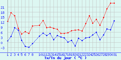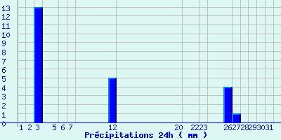 | Statistiques du mois | | Jours de fortes chaleurs (Tmax >= 30°C) | 0 | | Jours de très fortes chaleurs (Tmax >= 35°C) | 0 | | Jours avec nuit tropicale (Tmin >= 20°C) | 0 | | Jours avec gelée (Tmin <= 0°C) | 4 | | Jours avec forte gelée (Tmin <= -5°C) | 0 | | Jours sans dégel (Tmax <= 0°C) | 0 | | Jours avec pluie (RR >= 1mm) | 4 |