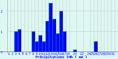 | Statistiques du mois | | Jours de fortes chaleurs (Tmax >= 30°C) | 0 | | Jours de très fortes chaleurs (Tmax >= 35°C) | 0 | | Jours avec nuit tropicale (Tmin >= 20°C) | 0 | | Jours avec gelée (Tmin <= 0°C) | 7 | | Jours avec forte gelée (Tmin <= -5°C) | 1 | | Jours sans dégel (Tmax <= 0°C) | 0 | | Jours avec pluie (RR >= 1mm) | 8 |
