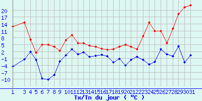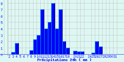 | Statistiques du mois | | Jours de fortes chaleurs (Tmax >= 30°C) | 0 | | Jours de très fortes chaleurs (Tmax >= 35°C) | 0 | | Jours avec nuit tropicale (Tmin >= 20°C) | 0 | | Jours avec gelée (Tmin <= 0°C) | 19 | | Jours avec forte gelée (Tmin <= -5°C) | 3 | | Jours sans dégel (Tmax <= 0°C) | 0 | | Jours avec pluie (RR >= 1mm) | 13 |