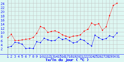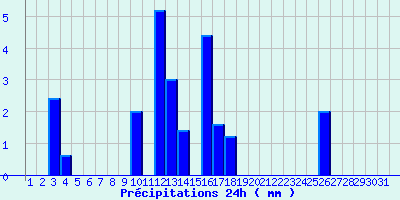 | Statistiques du mois | | Jours de fortes chaleurs (Tmax >= 30°C) | 0 | | Jours de très fortes chaleurs (Tmax >= 35°C) | 0 | | Jours avec nuit tropicale (Tmin >= 20°C) | 0 | | Jours avec gelée (Tmin <= 0°C) | 0 | | Jours avec forte gelée (Tmin <= -5°C) | 0 | | Jours sans dégel (Tmax <= 0°C) | 0 | | Jours avec pluie (RR >= 1mm) | 9 |