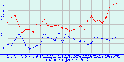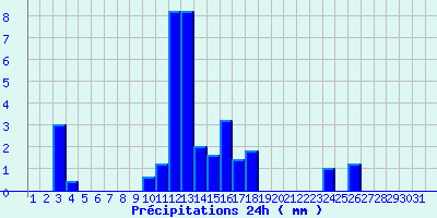 | Statistiques du mois | | Jours de fortes chaleurs (Tmax >= 30°C) | 0 | | Jours de très fortes chaleurs (Tmax >= 35°C) | 0 | | Jours avec nuit tropicale (Tmin >= 20°C) | 0 | | Jours avec gelée (Tmin <= 0°C) | 8 | | Jours avec forte gelée (Tmin <= -5°C) | 0 | | Jours sans dégel (Tmax <= 0°C) | 0 | | Jours avec pluie (RR >= 1mm) | 11 |