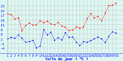 | Statistiques du mois | | Jours de fortes chaleurs (Tmax >= 30°C) | 0 | | Jours de très fortes chaleurs (Tmax >= 35°C) | 0 | | Jours avec nuit tropicale (Tmin >= 20°C) | 0 | | Jours avec gelée (Tmin <= 0°C) | 7 | | Jours avec forte gelée (Tmin <= -5°C) | 0 | | Jours sans dégel (Tmax <= 0°C) | 0 | | Jours avec pluie (RR >= 1mm) | 6 |