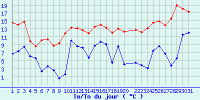 | Statistiques du mois | | Jours de fortes chaleurs (Tmax >= 30°C) | 0 | | Jours de très fortes chaleurs (Tmax >= 35°C) | 0 | | Jours avec nuit tropicale (Tmin >= 20°C) | 0 | | Jours avec gelée (Tmin <= 0°C) | 0 | | Jours avec forte gelée (Tmin <= -5°C) | 0 | | Jours sans dégel (Tmax <= 0°C) | 0 | | Jours avec pluie (RR >= 1mm) | 7 |