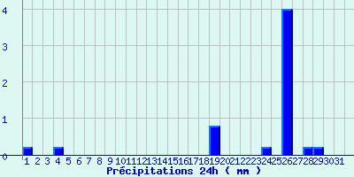 | Statistiques du mois | | Jours de fortes chaleurs (Tmax >= 30°C) | 0 | | Jours de très fortes chaleurs (Tmax >= 35°C) | 0 | | Jours avec nuit tropicale (Tmin >= 20°C) | 0 | | Jours avec gelée (Tmin <= 0°C) | 0 | | Jours avec forte gelée (Tmin <= -5°C) | 0 | | Jours sans dégel (Tmax <= 0°C) | 0 | | Jours avec pluie (RR >= 1mm) | 1 |
