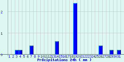 | Statistiques du mois | | Jours de fortes chaleurs (Tmax >= 30°C) | 0 | | Jours de très fortes chaleurs (Tmax >= 35°C) | 0 | | Jours avec nuit tropicale (Tmin >= 20°C) | 0 | | Jours avec gelée (Tmin <= 0°C) | 0 | | Jours avec forte gelée (Tmin <= -5°C) | 0 | | Jours sans dégel (Tmax <= 0°C) | 0 | | Jours avec pluie (RR >= 1mm) | 1 |