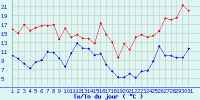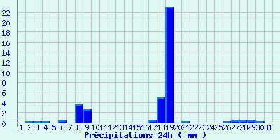 | Statistiques du mois | | Jours de fortes chaleurs (Tmax >= 30°C) | 0 | | Jours de très fortes chaleurs (Tmax >= 35°C) | 0 | | Jours avec nuit tropicale (Tmin >= 20°C) | 0 | | Jours avec gelée (Tmin <= 0°C) | 0 | | Jours avec forte gelée (Tmin <= -5°C) | 0 | | Jours sans dégel (Tmax <= 0°C) | 0 | | Jours avec pluie (RR >= 1mm) | 4 |