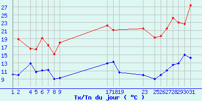 | Statistiques du mois | | Jours de fortes chaleurs (Tmax >= 30°C) | 0 | | Jours de très fortes chaleurs (Tmax >= 35°C) | 0 | | Jours avec nuit tropicale (Tmin >= 20°C) | 0 | | Jours avec gelée (Tmin <= 0°C) | 0 | | Jours avec forte gelée (Tmin <= -5°C) | 0 | | Jours sans dégel (Tmax <= 0°C) | 0 | | Jours avec pluie (RR >= 1mm) | 1 |