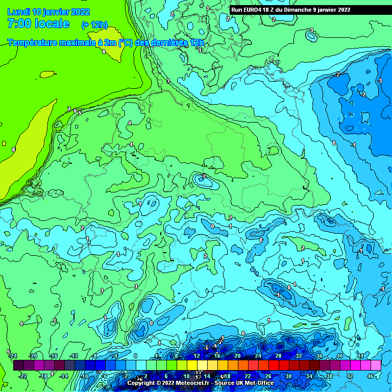 Ces cartes présentent les prévisions du modèle anglais EURO4 qui est généré toutes les 6 heures. La résolution est de 4km. La génération des cartes prennent généralement 20min pour une échéance de 54h pour les runs de 0Z,6Z,12Z,18Z.