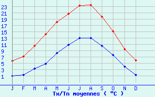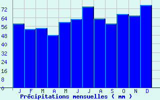 | Jan | Fev | Mars | Avr | Mai | Juin | Juil | Aout | Sept | Oct | Nov | Dec | Année | | Temp. max. (°C) | 5.8 | 7.1 | 10.6 | 14.2 | 18 | 20.6 | 23.2 | 23.5 | 19.7 | 15.1 | 9.4 | 6 | 14.5 | | Temp. moy. (°C) | 3.4 | 4.2 | 7 | 9.5 | 13.1 | 15.7 | 18.1 | 18.2 | 15.2 | 11.4 | 6.7 | 3.7 | 10.6 | | Temp. min. (°C) | 1 | 1.3 | 3.3 | 4.9 | 8.3 | 10.8 | 13 | 13 | 10.6 | 7.6 | 3.9 | 1.4 | 6.6 | | Jan | Fev | Mars | Avr | Mai | Juin | Juil | Aout | Sept | Oct | Nov | Dec | Année | | Jours Tx > 30°C | 0 | 0 | 0 | 0 | 0.1 | 0.5 | 2.2 | 2.5 | 0.1 | 0 | 0 | 0 | 5.4 | | Jours Tx > 25°C | 0 | 0 | 0 | 0.4 | 2.5 | 5 | 9.6 | 9.4 | 2.8 | 0 | 0 | 0 | 29.7 | | Jours Tx < 0°C | 2.6 | 1.2 | 0.2 | 0 | 0 | 0 | 0 | 0 | 0 | 0 | 0.5 | 2.6 | 7.1 | | Jours Tn < 0°C | 12 | 9.7 | 6.1 | 2.4 | 0 | 0 | 0 | 0 | 0 | 0.8 | 5.2 | 12.1 | 48.3 | | Jours Tn < -5°C | 3 | 1.5 | 0.2 | 0 | 0 | 0 | 0 | 0 | 0 | 0 | 0.5 | 2.2 | 7.4 | | Jours Tn < -10°C | 0.6 | 0.1 | 0 | 0 | 0 | 0 | 0 | 0 | 0 | 0 | 0 | 0.2 | 0.9 | | | | Jan | Fev | Mars | Avr | Mai | Juin | Juil | Aout | Sept | Oct | Nov | Dec | Année | | RR mensuel (mm) | 58.3 | 53.4 | 54.2 | 48.1 | 59.6 | 62.5 | 74 | 62.9 | 58.5 | 67 | 65.8 | 75.6 | 739.9 | | Jan | Fev | Mars | Avr | Mai | Juin | Juil | Aout | Sept | Oct | Nov | Dec | Année | | Jours RR > 1mm | 11.1 | 10.3 | 10.7 | 9.4 | 10.3 | 9.2 | 10.5 | 9.3 | 10 | 11.3 | 12.8 | 12.3 | 127.3 | | Jours RR > 5mm | 4.4 | 4.2 | 3.7 | 3.4 | 4.7 | 4.2 | 4.7 | 4.5 | 3.6 | 4.5 | 4.8 | 5.5 | 52.1 | | Jours RR > 10mm | 1.6 | 1.3 | 1.2 | 1 | 1.6 | 1.8 | 2.5 | 1.7 | 1.5 | 1.9 | 1.3 | 2.1 | 19.4 | | | | Jan | Fev | Mars | Avr | Mai | Juin | Juil | Aout | Sept | Oct | Nov | Dec | Année | | Vent moyen (km/h) | 14 | 14 | 14 | 12.2 | 10.4 | 9.7 | 10.4 | 9.7 | 9.7 | 11.2 | 11.9 | 13.3 | 11.9 | | Jan | Fev | Mars | Avr | Mai | Juin | Juil | Aout | Sept | Oct | Nov | Dec | Année | | Jours rafales >= 58km/h | -- | -- | 6.6 | 3.8 | -- | -- | 2.1 | 2.1 | 2.1 | -- | 2.9 | -- | -- | | Jours rafales >= 100km/h | -- | -- | 0.1 | 0 | -- | -- | 0 | 0 | 0 | -- | 0 | -- | -- |
