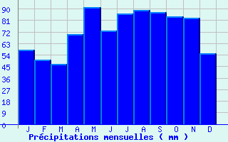 | Jan | Fev | Mars | Avr | Mai | Juin | Juil | Aout | Sept | Oct | Nov | Dec | Année | | Temp. max. (°C) | 6.4 | 8.2 | 12 | 14.8 | 19.5 | 23.6 | 25.7 | 25.3 | 20.6 | 16.6 | 9.9 | 6.4 | 15.8 | | Temp. moy. (°C) | 2.1 | 3.3 | 5.9 | 8.6 | 12.9 | 16.5 | 18.4 | 18 | 13.9 | 10.9 | 5.5 | 2.5 | 9.9 | | Temp. min. (°C) | -2.2 | -1.7 | -0.2 | 2.4 | 6.4 | 9.3 | 11.1 | 10.7 | 7.2 | 5.2 | 1.2 | -1.4 | 4 | | Jan | Fev | Mars | Avr | Mai | Juin | Juil | Aout | Sept | Oct | Nov | Dec | Année | | Jours Tx > 30°C | 0 | 0 | 0 | 0 | 0.2 | 3.8 | 6.3 | 6.4 | 0.7 | 0 | 0 | 0 | 17.3 | | Jours Tx > 25°C | 0 | 0 | 0.1 | 0.5 | 4.5 | 12.4 | 17.8 | 15.5 | 5.8 | 0.7 | 0 | 0 | 57.3 | | Jours Tx < 0°C | 4 | 2.1 | 0.4 | 0 | 0 | 0 | 0 | 0 | 0 | 0 | 0.6 | 3.7 | 10.9 | | Jours Tn < 0°C | 20.7 | 17.8 | 16.6 | 8.6 | 1.4 | 0.1 | 0 | 0.2 | 1.1 | 3.7 | 11.9 | 19.2 | 101.1 | | Jours Tn < -5°C | 8.2 | 6.4 | 3.8 | 0.4 | 0 | 0 | 0 | 0 | 0 | 0.6 | 3 | 6.2 | 28.7 | | Jours Tn < -10°C | 1.7 | 0.8 | 0.2 | 0 | 0 | 0 | 0 | 0 | 0 | 0.1 | 0.3 | 1.8 | 4.8 | | | | Jan | Fev | Mars | Avr | Mai | Juin | Juil | Aout | Sept | Oct | Nov | Dec | Année | | RR mensuel (mm) | 57.8 | 50 | 46.6 | 69.9 | 91.5 | 73 | 86 | 88.8 | 87.5 | 83.8 | 83.1 | 55.3 | 873.3 | | Jan | Fev | Mars | Avr | Mai | Juin | Juil | Aout | Sept | Oct | Nov | Dec | Année | | Jours RR > 1mm | 10.4 | 9.5 | 8.6 | 10.7 | 10.9 | 8.3 | 9.5 | 9.9 | 9.6 | 10.3 | 10.8 | 10.9 | 119.4 | | Jours RR > 5mm | 4.5 | 3.7 | 3.2 | 4.7 | 5.4 | 4.6 | 4.9 | 4.8 | 5 | 5.1 | 4.8 | 2.9 | 53.7 | | Jours RR > 10mm | 1.6 | 1.1 | 1.2 | 1.9 | 3.2 | 2.2 | 2.6 | 2.5 | 2.9 | 2.3 | 2.2 | 0.9 | 24.8 | | | | Jan | Fev | Mars | Avr | Mai | Juin | Juil | Aout | Sept | Oct | Nov | Dec | Année | | Vent moyen (km/h) | 6.1 | 6.8 | 7.6 | 7.9 | 7.6 | 6.8 | 6.8 | 5.8 | 5.8 | 5.8 | 6.5 | 6.1 | 6.5 | | Jan | Fev | Mars | Avr | Mai | Juin | Juil | Aout | Sept | Oct | Nov | Dec | Année | | Jours rafales >= 58km/h | 2.2 | 1.9 | 1.9 | 2.8 | 1.3 | -- | -- | 0.9 | 0.9 | 1.9 | 2.4 | 1.6 | -- | | Jours rafales >= 100km/h | 0 | 0 | 0 | 0 | 0 | -- | -- | 0 | 0 | 0 | 0 | 0.1 | -- | | | | Jan | Fev | Mars | Avr | Mai | Juin | Juil | Aout | Sept | Oct | Nov | Dec | Année | | Ensoleillement (heures) | 91.2 | 115.6 | 162.5 | 167.2 | 196.7 | 250.8 | 259.6 | 215.6 | 182.3 | 139.9 | 83.4 | 73.5 | 1938 |