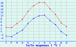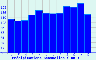 | Jan | Fev | Mars | Avr | Mai | Juin | Juil | Aout | Sept | Oct | Nov | Dec | Année | | Temp. max. (°C) | 2.4 | 2.3 | 4.7 | 7.4 | 12.4 | 15.9 | 17.9 | 18 | 13.9 | 10.4 | 5.1 | 2.8 | 9.5 | | Temp. moy. (°C) | -0.4 | -0.6 | 1.7 | 4 | 8.6 | 11.9 | 13.8 | 14 | 10.3 | 7.3 | 2.4 | 0.1 | 6.1 | | Temp. min. (°C) | -3.1 | -3.5 | -1.3 | 0.6 | 4.7 | 7.9 | 9.6 | 10 | 6.7 | 4.2 | -0.3 | -2.6 | 2.8 | | Jan | Fev | Mars | Avr | Mai | Juin | Juil | Aout | Sept | Oct | Nov | Dec | Année | | Jours Tx > 30°C | 0 | 0 | 0 | 0 | 0 | 0 | 0 | 0.1 | 0 | 0 | 0 | 0 | 0.1 | | Jours Tx > 25°C | 0 | 0 | 0 | 0 | 0 | 1 | 2.3 | 2.5 | 0.1 | 0 | 0 | 0 | 5.8 | | Jours Tx < 0°C | 8.1 | 9.7 | 6.4 | 2.5 | 0.4 | 0 | 0 | 0 | 0 | 0.7 | 4.9 | 8.3 | 40.8 | | Jours Tn < 0°C | 24.3 | 22.2 | 19 | 13.7 | 3.3 | 0.3 | 0 | 0 | 0.7 | 5 | 16.2 | 21.7 | 126.3 | | Jours Tn < -5°C | 8.5 | 9 | 5.6 | 1.8 | 0.1 | 0 | 0 | 0 | 0 | 0.3 | 4 | 8.1 | 37.3 | | Jours Tn < -10°C | 2.1 | 2.8 | 0.6 | 0.1 | 0 | 0 | 0 | 0 | 0 | 0 | 0.2 | 2.1 | 7.8 | | | | Jan | Fev | Mars | Avr | Mai | Juin | Juil | Aout | Sept | Oct | Nov | Dec | Année | | RR mensuel (mm) | 113.1 | 106.9 | 108.5 | 126.8 | 141.8 | 133.5 | 130.8 | 133.6 | 156.1 | 153.1 | 167 | 128.8 | 1600 | | Jan | Fev | Mars | Avr | Mai | Juin | Juil | Aout | Sept | Oct | Nov | Dec | Année | | Jours RR > 1mm | 12.8 | 11.4 | 11.7 | 14.1 | 14.6 | 11.1 | 10.9 | 12 | 12.5 | 13.4 | 14.7 | 12.9 | 151.8 | | Jours RR > 5mm | 7.3 | 6.8 | 7.2 | 8.3 | 9 | 7.1 | 7.1 | 7.4 | 7.9 | 9.4 | 10 | 8.2 | 95.6 | | Jours RR > 10mm | 4.2 | 3.7 | 4.2 | 4.7 | 5.5 | 4.4 | 4.6 | 4.5 | 5.3 | 6 | 6.4 | 4.8 | 58.1 | | | | Jan | Fev | Mars | Avr | Mai | Juin | Juil | Aout | Sept | Oct | Nov | Dec | Année | | Vent moyen (km/h) | 21.2 | 19.8 | 20.5 | 19.4 | 16.9 | 15.1 | 13 | 12.6 | 15.5 | 18 | 19.8 | 22 | 17.6 | | Jan | Fev | Mars | Avr | Mai | Juin | Juil | Aout | Sept | Oct | Nov | Dec | Année | | Jours rafales >= 58km/h | 16.2 | -- | 14 | 12.8 | 9.6 | -- | 5.4 | -- | 7.9 | 10.9 | -- | 16.2 | -- | | Jours rafales >= 100km/h | 1.9 | -- | 1.1 | 1.2 | 0.6 | -- | 0.1 | -- | 0.2 | 0.8 | -- | 1.9 | -- |