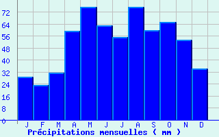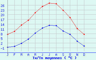 | Jan | Fev | Mars | Avr | Mai | Juin | Juil | Aout | Sept | Oct | Nov | Dec | Année | | Temp. max. (°C) | 7.6 | 9.5 | 13.4 | 16.5 | 21.3 | 25.3 | 27.4 | 27 | 22.8 | 18.1 | 11.2 | 7.6 | 17.3 | | Temp. moy. (°C) | 3.5 | 4.7 | 7.7 | 10.5 | 14.8 | 18.5 | 20.3 | 20.1 | 16.2 | 12.8 | 7.2 | 3.8 | 11.7 | | Temp. min. (°C) | -0.6 | 0 | 1.9 | 4.5 | 8.4 | 11.6 | 13.2 | 13.1 | 9.7 | 7.5 | 3.2 | 0.1 | 6.1 | | Jan | Fev | Mars | Avr | Mai | Juin | Juil | Aout | Sept | Oct | Nov | Dec | Année | | Jours Tx > 30°C | 0 | 0 | 0 | 0 | 1.1 | 6.6 | 9.3 | 9.4 | 1.8 | 0 | 0 | 0 | 28.2 | | Jours Tx > 25°C | 0 | 0 | 0.2 | 1.4 | 7 | 15 | 21.4 | 18.4 | 10.3 | 2.3 | 0 | 0 | 76 | | Jours Tx < 0°C | 3.2 | 1.4 | 0.2 | 0 | 0 | 0 | 0 | 0 | 0 | 0 | 0.3 | 2.4 | 7.5 | | Jours Tn < 0°C | 16.8 | 14.6 | 12.2 | 3.6 | 0.1 | 0 | 0 | 0 | 0 | 2.1 | 7.4 | 14.2 | 71 | | Jours Tn < -5°C | 5.2 | 4.2 | 2.1 | 0.1 | 0 | 0 | 0 | 0 | 0 | 0.2 | 1.3 | 4.3 | 17.3 | | Jours Tn < -10°C | 0.8 | 0.4 | 0.2 | 0 | 0 | 0 | 0 | 0 | 0 | 0 | 0.2 | 0.8 | 2.3 | | | | Jan | Fev | Mars | Avr | Mai | Juin | Juil | Aout | Sept | Oct | Nov | Dec | Année | | RR mensuel (mm) | 28.5 | 23 | 31.3 | 59.5 | 75.3 | 63.2 | 55.4 | 75.6 | 59.6 | 65.2 | 53.6 | 34 | 624.2 | | Jan | Fev | Mars | Avr | Mai | Juin | Juil | Aout | Sept | Oct | Nov | Dec | Année | | Jours RR > 1mm | 6.9 | 5.9 | 7.3 | 8.6 | 9.3 | 7.4 | 7.9 | 8.9 | 6.9 | 8.7 | 8.9 | 6 | 92.7 | | Jours RR > 5mm | 1.6 | 0.9 | 1.7 | 3.6 | 4.9 | 3.6 | 3.7 | 4.1 | 3.3 | 4.1 | 3.2 | 1.6 | 36.4 | | Jours RR > 10mm | 0.4 | 0.2 | 0.5 | 1.9 | 2.6 | 2.2 | 1.6 | 2.1 | 2 | 1.9 | 1.4 | 0.8 | 17.4 | | | | Jan | Fev | Mars | Avr | Mai | Juin | Juil | Aout | Sept | Oct | Nov | Dec | Année | | Vent moyen (km/h) | 8.3 | 9 | 10.1 | 9.4 | 7.9 | 7.6 | 7.6 | 6.8 | 6.5 | 7.9 | 8.3 | 8.6 | 8.3 | | Jan | Fev | Mars | Avr | Mai | Juin | Juil | Aout | Sept | Oct | Nov | Dec | Année | | Jours rafales >= 58km/h | 2.9 | 2.9 | 3.5 | 3.1 | 0.6 | 1.3 | 1.7 | 1.3 | 1.2 | 2.5 | 2 | -- | -- | | Jours rafales >= 100km/h | 0 | 0 | 0 | 0 | 0 | 0 | 0 | 0.1 | 0 | 0 | 0 | -- | -- | | | | Jan | Fev | Mars | Avr | Mai | Juin | Juil | Aout | Sept | Oct | Nov | Dec | Année | | Ensoleillement (heures) | 86.9 | 105.9 | 156.4 | 167.5 | 201.5 | 251.1 | 258.8 | 220.2 | 173.7 | 129.6 | 77.7 | 67.7 | 1897.1 |