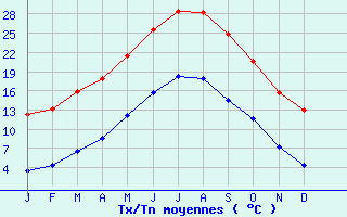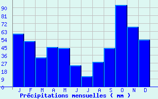 | Jan | Fev | Mars | Avr | Mai | Juin | Juil | Aout | Sept | Oct | Nov | Dec | Année | | Temp. max. (°C) | 12.3 | 13.1 | 15.9 | 17.9 | 21.5 | 25.6 | 28.5 | 28.3 | 24.8 | 20.6 | 15.8 | 13 | 19.8 | | Temp. moy. (°C) | 8 | 8.7 | 11.2 | 13.2 | 16.8 | 20.7 | 23.4 | 23.2 | 19.7 | 16.1 | 11.6 | 8.7 | 15.1 | | Temp. min. (°C) | 3.6 | 4.4 | 6.6 | 8.6 | 12.1 | 15.8 | 18.2 | 18 | 14.5 | 11.6 | 7.3 | 4.4 | 10.5 | | Jan | Fev | Mars | Avr | Mai | Juin | Juil | Aout | Sept | Oct | Nov | Dec | Année | | Jours Tx > 30°C | 0 | 0 | 0 | 0 | 0.4 | 3.3 | 9.7 | 8 | 1.6 | 0.2 | 0 | 0 | 23.2 | | Jours Tx > 25°C | 0 | 0 | 0.3 | 0.6 | 4.2 | 16.8 | 27.6 | 27.6 | 14.5 | 2.7 | 0 | 0 | 94.3 | | Jours Tx < 0°C | 0.1 | 0 | 0 | 0 | 0 | 0 | 0 | 0 | 0 | 0 | 0 | 0 | 0.1 | | Jours Tn < 0°C | 6.2 | 4.5 | 1.2 | 0 | 0 | 0 | 0 | 0 | 0 | 0 | 1.6 | 4.5 | 17.9 | | Jours Tn < -5°C | 0.6 | 0.1 | 0.1 | 0 | 0 | 0 | 0 | 0 | 0 | 0 | 0.1 | 0.1 | 0.9 | | Jours Tn < -10°C | 0 | 0 | 0 | 0 | 0 | 0 | 0 | 0 | 0 | 0 | 0 | 0 | 0 | | | | Jan | Fev | Mars | Avr | Mai | Juin | Juil | Aout | Sept | Oct | Nov | Dec | Année | | RR mensuel (mm) | 60.3 | 51.9 | 33.2 | 44.7 | 44.1 | 23.8 | 11.8 | 27.9 | 43.6 | 93.3 | 68.2 | 53.5 | 556.3 | | Jan | Fev | Mars | Avr | Mai | Juin | Juil | Aout | Sept | Oct | Nov | Dec | Année | | Jours RR > 1mm | 5 | 3.8 | 3.6 | 5.3 | 5.2 | 3.6 | 2.2 | 3.2 | 4.2 | 4.8 | 4.8 | 5 | 50.7 | | Jours RR > 5mm | 2.6 | 2 | 1.7 | 2.3 | 2.3 | 1.3 | 0.8 | 1.7 | 2.1 | 2.9 | 2.1 | 2.5 | 24.3 | | Jours RR > 10mm | 1.8 | 1.3 | 1.2 | 1 | 1.4 | 0.4 | 0.3 | 0.7 | 1.2 | 2.2 | 1.5 | 1.5 | 14.5 | | | | Jan | Fev | Mars | Avr | Mai | Juin | Juil | Aout | Sept | Oct | Nov | Dec | Année | | Vent moyen (km/h) | 14 | 15.5 | 15.5 | 14.8 | 12.6 | 12.6 | 12.6 | 11.9 | 11.5 | 11.2 | 13.3 | 13.3 | 13.3 | | Jan | Fev | Mars | Avr | Mai | Juin | Juil | Aout | Sept | Oct | Nov | Dec | Année | | Jours rafales >= 58km/h | 11.7 | 12.7 | 12.8 | 11 | 7.4 | 6.7 | 7.7 | 6.3 | -- | -- | 11.3 | 11.5 | -- | | Jours rafales >= 100km/h | 0.7 | 0.5 | 0.3 | 0.5 | 0.1 | 0 | 0 | 0 | -- | -- | 0.3 | 0.7 | -- | | | | Jan | Fev | Mars | Avr | Mai | Juin | Juil | Aout | Sept | Oct | Nov | Dec | Année | | Ensoleillement (heures) | 137.7 | 164.1 | 211.9 | 216.9 | 237.4 | 277.1 | 304.2 | 266 | 224.5 | 172.9 | 149.1 | 127.5 | 2489.1 |