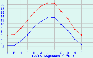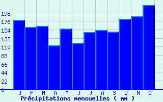 | Jan | Fev | Mars | Avr | Mai | Juin | Juil | Aout | Sept | Oct | Nov | Dec | Année | | Temp. max. (°C) | 3.8 | 4.2 | 7.3 | 11.6 | 15.9 | 19.3 | 20.9 | 20.7 | 16.4 | 12.6 | 6.8 | 3.9 | 12 | | Temp. moy. (°C) | 1.1 | 1.3 | 4.1 | 7.8 | 12.1 | 15.3 | 17 | 16.9 | 12.9 | 9.5 | 4.2 | 1.4 | 8.7 | | Temp. min. (°C) | -1.6 | -1.5 | 0.8 | 4 | 8.2 | 11.2 | 13 | 13.1 | 9.5 | 6.4 | 1.6 | -1.1 | 5.3 | | Jan | Fev | Mars | Avr | Mai | Juin | Juil | Aout | Sept | Oct | Nov | Dec | Année | | Jours Tx > 30°C | 0 | 0 | 0 | 0 | 0 | 0.3 | 0.6 | 0.9 | 0 | 0 | 0 | 0 | 1.7 | | Jours Tx > 25°C | 0 | 0 | 0 | 0 | 0.9 | 4.4 | 7.2 | 6.4 | 1 | 0.1 | 0 | 0 | 20 | | Jours Tx < 0°C | 6 | 6.6 | 2.7 | 0.2 | 0 | 0 | 0 | 0 | 0 | 0 | 3.2 | 6.4 | 25.1 | | Jours Tn < 0°C | 19.3 | 17 | 13.1 | 5.6 | 0.1 | 0 | 0 | 0 | 0 | 1.7 | 10.1 | 18.2 | 85.1 | | Jours Tn < -5°C | 6.5 | 5.9 | 3.1 | 0.2 | 0 | 0 | 0 | 0 | 0 | 0 | 2.2 | 6.2 | 24 | | Jours Tn < -10°C | 1.4 | 0.7 | 0.2 | 0 | 0 | 0 | 0 | 0 | 0 | 0 | 0.2 | 0.8 | 3.4 | | | | Jan | Fev | Mars | Avr | Mai | Juin | Juil | Aout | Sept | Oct | Nov | Dec | Année | | RR mensuel (mm) | 178.7 | 160.3 | 163.1 | 112.9 | 156.5 | 119.6 | 147.3 | 153 | 149 | 182.3 | 188.6 | 218.3 | 1929.6 | | Jan | Fev | Mars | Avr | Mai | Juin | Juil | Aout | Sept | Oct | Nov | Dec | Année | | Jours RR > 1mm | 14.1 | 13.1 | 13.6 | 12.5 | 15.3 | 11.7 | 13.3 | 13.4 | 12.2 | 13.4 | 14.7 | 15.7 | 162.9 | | Jours RR > 5mm | 9.1 | 8.7 | 8.6 | 7.4 | 9.3 | 7.3 | 8.6 | 8.3 | 7.8 | 10.1 | 10.2 | 10.6 | 106.1 | | Jours RR > 10mm | 6.3 | 6 | 5.8 | 4.6 | 5.4 | 4.6 | 5.2 | 6 | 5.5 | 7.3 | 6.5 | 7.6 | 70.8 | | | | Jan | Fev | Mars | Avr | Mai | Juin | Juil | Aout | Sept | Oct | Nov | Dec | Année | | Vent moyen (km/h) | 8.6 | -- | 8.3 | 8.6 | 7.9 | 7.6 | 7.6 | 7.2 | 7.9 | 8.3 | 7.9 | -- | -- | | Jan | Fev | Mars | Avr | Mai | Juin | Juil | Aout | Sept | Oct | Nov | Dec | Année | | Jours rafales >= 58km/h | 5.4 | -- | 3.9 | 2.9 | -- | -- | 1.1 | 1.5 | 1.7 | 4.2 | 4.3 | -- | -- | | Jours rafales >= 100km/h | 0.1 | -- | 0 | 0 | -- | -- | 0 | 0 | 0 | 0.1 | 0 | -- | -- |