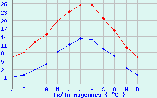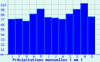 | Jan | Fev | Mars | Avr | Mai | Juin | Juil | Aout | Sept | Oct | Nov | Dec | Année | | Temp. max. (°C) | 6.4 | 8.1 | 12 | 14.8 | 19.8 | 23.1 | 25.6 | 25.6 | 20.6 | 16.2 | 10 | 6.4 | 15.8 | | Temp. moy. (°C) | 2.7 | 3.9 | 7 | 9.4 | 14 | 17.1 | 19.4 | 19.3 | 15 | 11.5 | 6.2 | 3.1 | 10.8 | | Temp. min. (°C) | -0.9 | -0.3 | 2 | 4 | 8.2 | 11.1 | 13.3 | 12.9 | 9.4 | 6.8 | 2.4 | -0.3 | 5.8 | | Jan | Fev | Mars | Avr | Mai | Juin | Juil | Aout | Sept | Oct | Nov | Dec | Année | | Jours Tx > 30°C | 0 | 0 | 0 | 0 | 0.2 | 2.2 | 5.5 | 6 | 0.1 | 0 | 0 | 0 | 14 | | Jours Tx > 25°C | 0 | 0 | 0.1 | 0.5 | 4.1 | 10.6 | 17 | 16.6 | 5.1 | 0.6 | 0 | 0 | 54.4 | | Jours Tx < 0°C | 3.9 | 1.9 | 0.2 | 0 | 0 | 0 | 0 | 0 | 0 | 0 | 0.7 | 3.7 | 10.3 | | Jours Tn < 0°C | 18.1 | 14.5 | 9.5 | 3.8 | 0.2 | 0 | 0 | 0 | 0 | 2.2 | 8.2 | 16 | 72.6 | | Jours Tn < -5°C | 6 | 4 | 1.6 | 0.1 | 0 | 0 | 0 | 0 | 0 | 0.2 | 1.9 | 5.1 | 18.8 | | Jours Tn < -10°C | 0.9 | 0.4 | 0.1 | 0 | 0 | 0 | 0 | 0 | 0 | 0 | 0.2 | 1 | 2.5 | | | | Jan | Fev | Mars | Avr | Mai | Juin | Juil | Aout | Sept | Oct | Nov | Dec | Année | | RR mensuel (mm) | 77.8 | 78.3 | 73.8 | 89.2 | 100.3 | 81.8 | 80.3 | 77.4 | 89.1 | 99.8 | 112.9 | 83 | 1043.7 | | Jan | Fev | Mars | Avr | Mai | Juin | Juil | Aout | Sept | Oct | Nov | Dec | Année | | Jours RR > 1mm | 11.6 | 10.7 | 10.3 | 12 | 12.7 | 10.3 | 9.1 | 9.4 | 8.7 | 12.7 | 12.8 | 12.3 | 132.5 | | Jours RR > 5mm | 5.3 | 5.4 | 5.5 | 5.5 | 6.6 | 5.4 | 5 | 4.7 | 5.1 | 6.7 | 6.9 | 5.8 | 67.8 | | Jours RR > 10mm | 2.4 | 2.4 | 2.3 | 2.5 | 3.1 | 2.5 | 2.8 | 2.6 | 2.8 | 3.4 | 3.9 | 2.7 | 33.4 | | | | Jan | Fev | Mars | Avr | Mai | Juin | Juil | Aout | Sept | Oct | Nov | Dec | Année | | Vent moyen (km/h) | 5.8 | 6.8 | 7.2 | 6.8 | 6.1 | 5.8 | 6.1 | 5.4 | 5 | 5.4 | 5.4 | 5.8 | 6.1 | | Jan | Fev | Mars | Avr | Mai | Juin | Juil | Aout | Sept | Oct | Nov | Dec | Année | | Jours rafales >= 58km/h | 2.1 | 2.5 | 2 | 1.5 | 0.6 | 1.1 | 1.4 | 0.9 | 0.4 | 1.1 | 1.4 | 1.8 | 16.6 | | Jours rafales >= 100km/h | 0.1 | 0 | 0 | 0 | 0 | 0 | 0 | 0 | 0 | 0 | 0 | 0.2 | 0.2 |