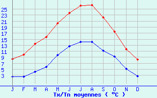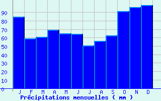 | Jan | Fev | Mars | Avr | Mai | Juin | Juil | Aout | Sept | Oct | Nov | Dec | Année | | Temp. max. (°C) | 8.4 | 9.9 | 13.4 | 15.8 | 20.3 | 23.7 | 26.1 | 26.4 | 22.2 | 17.5 | 11.6 | 8.3 | 17 | | Temp. moy. (°C) | 5.5 | 6.2 | 8.8 | 10.8 | 15 | 18.1 | 20.1 | 20.3 | 16.7 | 13.3 | 8.4 | 5.5 | 12.4 | | Temp. min. (°C) | 2.6 | 2.5 | 4.2 | 5.9 | 9.7 | 12.6 | 14.1 | 14.2 | 11.2 | 9.2 | 5.1 | 2.7 | 7.9 | | Jan | Fev | Mars | Avr | Mai | Juin | Juil | Aout | Sept | Oct | Nov | Dec | Année | | Jours Tx > 30°C | 0 | 0 | 0 | 0.1 | 0.6 | 3.3 | 5.6 | 6.7 | 1 | 0 | 0 | 0 | 17.2 | | Jours Tx > 25°C | 0 | 0 | 0.1 | 0.9 | 5 | 11.3 | 17.9 | 17.9 | 6.7 | 1.1 | 0 | 0 | 60.8 | | Jours Tx < 0°C | 1.5 | 0.4 | 0.1 | 0 | 0 | 0 | 0 | 0 | 0 | 0 | 0.1 | 1.4 | 3.4 | | Jours Tn < 0°C | 9.7 | 9.7 | 4.7 | 1.4 | 0 | 0 | 0 | 0 | 0 | 0.7 | 4.2 | 9.8 | 40.2 | | Jours Tn < -5°C | 1.7 | 0.3 | 0.2 | 0 | 0 | 0 | 0 | 0 | 0 | 0 | 0.5 | 1.4 | 4 | | Jours Tn < -10°C | 0.1 | 0 | 0 | 0 | 0 | 0 | 0 | 0 | 0 | 0 | 0 | 0.1 | 0.2 | | | | Jan | Fev | Mars | Avr | Mai | Juin | Juil | Aout | Sept | Oct | Nov | Dec | Année | | RR mensuel (mm) | 84.8 | 58.8 | 61 | 69.4 | 64.9 | 64.6 | 50.7 | 56 | 62.8 | 91.5 | 96 | 98.9 | 859.4 | | Jan | Fev | Mars | Avr | Mai | Juin | Juil | Aout | Sept | Oct | Nov | Dec | Année | | Jours RR > 1mm | 12.2 | 9.6 | 9.7 | 11.1 | 10.6 | 7.9 | 8 | 6.7 | 8.3 | 11.6 | 13.6 | 12.3 | 121.4 | | Jours RR > 5mm | 5.9 | 3.9 | 4.3 | 5.1 | 5.1 | 4.2 | 3.2 | 3.5 | 3.7 | 5.6 | 6.8 | 6.7 | 57.7 | | Jours RR > 10mm | 2.7 | 1.8 | 1.6 | 1.9 | 2.1 | 1.9 | 1.6 | 1.9 | 2 | 3.1 | 2.7 | 3.8 | 26.8 | | | | Jan | Fev | Mars | Avr | Mai | Juin | Juil | Aout | Sept | Oct | Nov | Dec | Année | | Vent moyen (km/h) | 12.2 | -- | 11.5 | 10.8 | 9.7 | 9 | 8.6 | 8.3 | 9 | 10.1 | 10.4 | 12.2 | -- | | Jan | Fev | Mars | Avr | Mai | Juin | Juil | Aout | Sept | Oct | Nov | Dec | Année | | Jours rafales >= 58km/h | 3.8 | 3.1 | 3.1 | 2.5 | 1.3 | 1.2 | 1 | 0.8 | 1 | 1.9 | 1.5 | -- | -- | | Jours rafales >= 100km/h | 0.1 | 0.1 | 0 | 0 | 0 | 0.1 | 0.1 | 0.1 | 0 | 0 | 0 | -- | -- |
