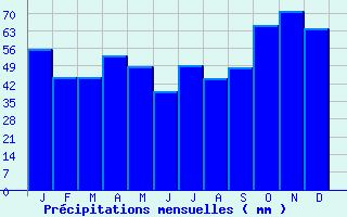 | Jan | Fev | Mars | Avr | Mai | Juin | Juil | Aout | Sept | Oct | Nov | Dec | Année | | Temp. max. (°C) | 8 | 9.5 | 13.2 | 15.8 | 20.1 | 23.6 | 25.8 | 26.1 | 22 | 17.1 | 11.4 | 8 | 16.8 | | Temp. moy. (°C) | 5.2 | 5.9 | 8.7 | 10.8 | 14.8 | 17.9 | 19.9 | 20.1 | 16.5 | 13 | 8.2 | 5.2 | 12.2 | | Temp. min. (°C) | 2.3 | 2.3 | 4.1 | 5.7 | 9.4 | 12.2 | 14 | 14.2 | 11.1 | 8.9 | 5 | 2.5 | 7.7 | | Jan | Fev | Mars | Avr | Mai | Juin | Juil | Aout | Sept | Oct | Nov | Dec | Année | | Jours Tx > 30°C | 0 | 0 | 0 | 0 | 0.5 | 2.5 | 5.3 | 5.8 | 1.1 | 0 | 0 | 0 | 15.1 | | Jours Tx > 25°C | 0 | 0 | 0 | 0.7 | 4.5 | 11 | 16.3 | 17.3 | 6.2 | 0.8 | 0 | 0 | 56.8 | | Jours Tx < 0°C | 1.7 | 1.1 | 0 | 0 | 0 | 0 | 0 | 0 | 0 | 0 | 0.2 | 1 | 3.9 | | Jours Tn < 0°C | 10.1 | 9.1 | 4.7 | 0.9 | 0 | 0 | 0 | 0 | 0 | 0.6 | 3.9 | 10.3 | 39.4 | | Jours Tn < -5°C | 2.1 | 1.1 | 0.2 | 0 | 0 | 0 | 0 | 0 | 0 | 0 | 0.5 | 1.3 | 5.1 | | Jours Tn < -10°C | 0.2 | 0.2 | 0 | 0 | 0 | 0 | 0 | 0 | 0 | 0 | 0 | 0.1 | 0.4 | | | | Jan | Fev | Mars | Avr | Mai | Juin | Juil | Aout | Sept | Oct | Nov | Dec | Année | | RR mensuel (mm) | 55.8 | 44.4 | 44.6 | 53 | 48.9 | 38.9 | 49.2 | 44.2 | 48.5 | 65.3 | 70.9 | 63.8 | 627.5 | | Jan | Fev | Mars | Avr | Mai | Juin | Juil | Aout | Sept | Oct | Nov | Dec | Année | | Jours RR > 1mm | 10 | 8.7 | 8.2 | 10.4 | 9 | 6.9 | 7 | 6.3 | 7.5 | 9.7 | 11.8 | 10.9 | 106.2 | | Jours RR > 5mm | 4 | 3.2 | 3.1 | 3.8 | 3.5 | 2.7 | 3 | 2.5 | 2.9 | 4.6 | 4.7 | 4.7 | 42.4 | | Jours RR > 10mm | 1.7 | 1.2 | 1.1 | 1.2 | 1 | 1 | 1.7 | 1.4 | 1.4 | 2.1 | 2.2 | 1.8 | 17.6 | | | | Jan | Fev | Mars | Avr | Mai | Juin | Juil | Aout | Sept | Oct | Nov | Dec | Année | | Vent moyen (km/h) | 14 | -- | 12.6 | 12.6 | 11.2 | 10.4 | 10.1 | 10.1 | 10.8 | 11.9 | 12.2 | 13.3 | -- | | Jan | Fev | Mars | Avr | Mai | Juin | Juil | Aout | Sept | Oct | Nov | Dec | Année | | Jours rafales >= 58km/h | 4.7 | 3.9 | 2.8 | 3.1 | 1.7 | 0.8 | 1.3 | 0.5 | 1.2 | 2.1 | 2.6 | 3.8 | 28.3 | | Jours rafales >= 100km/h | 0.1 | 0.1 | 0 | 0.1 | 0 | 0 | 0 | 0 | 0 | 0 | 0 | 0.1 | 0.2 | | | | Jan | Fev | Mars | Avr | Mai | Juin | Juil | Aout | Sept | Oct | Nov | Dec | Année | | Ensoleillement (heures) | -- | 101.1 | -- | 194.2 | 218.8 | 265.7 | 254.4 | 234.8 | -- | 134 | 82 | -- | -- |