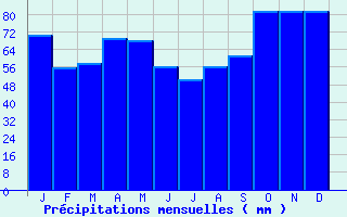 | Jan | Fev | Mars | Avr | Mai | Juin | Juil | Aout | Sept | Oct | Nov | Dec | Année | | Temp. max. (°C) | 8 | 9.4 | 13.1 | 15.6 | 20 | 23.6 | 26 | 26.3 | 21.9 | 17.1 | 11.4 | 8 | 16.7 | | Temp. moy. (°C) | 5.2 | 5.8 | 8.7 | 10.8 | 14.9 | 18.2 | 20.3 | 20.5 | 16.6 | 13.1 | 8.1 | 5.3 | 12.3 | | Temp. min. (°C) | 2.3 | 2.2 | 4.3 | 6 | 9.8 | 12.9 | 14.5 | 14.6 | 11.3 | 9.1 | 4.9 | 2.6 | 7.9 | | Jan | Fev | Mars | Avr | Mai | Juin | Juil | Aout | Sept | Oct | Nov | Dec | Année | | Jours Tx > 30°C | 0 | 0 | 0 | 0.1 | 0.3 | 3.1 | 5.5 | 6.9 | 0.7 | 0 | 0 | 0 | 16.4 | | Jours Tx > 25°C | 0 | 0 | 0 | 0.7 | 4.6 | 11.7 | 17.2 | 17.4 | 6.1 | 0.9 | 0 | 0 | 58.5 | | Jours Tx < 0°C | 1.8 | 0.8 | 0.1 | 0 | 0 | 0 | 0 | 0 | 0 | 0 | 0.2 | 1.4 | 4.3 | | Jours Tn < 0°C | 10 | 9.6 | 4.6 | 1.1 | 0 | 0 | 0 | 0 | 0 | 0.8 | 4.1 | 10.4 | 40.6 | | Jours Tn < -5°C | 1.8 | 1 | 0.2 | 0 | 0 | 0 | 0 | 0 | 0 | 0 | 0.5 | 1.5 | 4.9 | | Jours Tn < -10°C | 0.2 | 0.1 | 0 | 0 | 0 | 0 | 0 | 0 | 0 | 0 | 0 | 0.1 | 0.4 | | | | Jan | Fev | Mars | Avr | Mai | Juin | Juil | Aout | Sept | Oct | Nov | Dec | Année | | RR mensuel (mm) | 70.7 | 55.5 | 57.5 | 69.2 | 68.3 | 56 | 50.1 | 56.1 | 61.3 | 81.7 | 81.4 | 81.3 | 789.1 | | Jan | Fev | Mars | Avr | Mai | Juin | Juil | Aout | Sept | Oct | Nov | Dec | Année | | Jours RR > 1mm | 11.7 | 9.7 | 10.2 | 12 | 10.4 | 7.7 | 7.5 | 7.6 | 8.4 | 11.9 | 13.2 | 11.3 | 121.5 | | Jours RR > 5mm | 4.9 | 3.7 | 4 | 5 | 4.9 | 3.6 | 3.3 | 3.6 | 4 | 5.6 | 5.2 | 5.7 | 53.3 | | Jours RR > 10mm | 1.8 | 1.5 | 1.5 | 1.7 | 1.8 | 1.9 | 1.4 | 1.9 | 1.9 | 2.3 | 2.3 | 2.7 | 22.5 | | | | Jan | Fev | Mars | Avr | Mai | Juin | Juil | Aout | Sept | Oct | Nov | Dec | Année | | Vent moyen (km/h) | 13.3 | 13 | 11.9 | 11.5 | 10.1 | 9.7 | 10.1 | 9.4 | 10.1 | 10.4 | 10.8 | 13 | 11.2 | | Jan | Fev | Mars | Avr | Mai | Juin | Juil | Aout | Sept | Oct | Nov | Dec | Année | | Jours rafales >= 58km/h | -- | -- | 3.1 | 2.5 | 1.2 | 1.3 | 1.3 | 1 | 1.1 | 2 | -- | 4.2 | -- | | Jours rafales >= 100km/h | -- | -- | 0 | 0 | 0.1 | 0 | 0 | 0.1 | 0.1 | 0 | -- | 0.2 | -- |