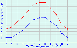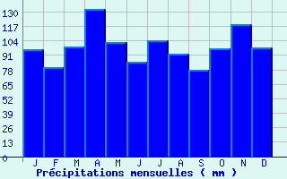 | Jan | Fev | Mars | Avr | Mai | Juin | Juil | Aout | Sept | Oct | Nov | Dec | Année | | Temp. max. (°C) | 6.7 | 7.9 | 11.3 | 14 | 18.5 | 22.5 | 23.6 | 23.6 | 20 | 15.9 | 9.4 | 6.8 | 15.1 | | Temp. moy. (°C) | 3.9 | 4.6 | 7.4 | 9.9 | 14 | 17.6 | 18.7 | 18.8 | 15.7 | 12.4 | 6.6 | 4.1 | 11.2 | | Temp. min. (°C) | 1.2 | 1.3 | 3.5 | 5.7 | 9.4 | 12.7 | 13.8 | 14 | 11.3 | 8.9 | 3.8 | 1.4 | 7.3 | | Jan | Fev | Mars | Avr | Mai | Juin | Juil | Aout | Sept | Oct | Nov | Dec | Année | | Jours Tx > 30°C | 0 | 0 | 0 | 0 | 0.2 | 1.5 | 2.9 | 3.3 | 0.2 | 0 | 0 | 0 | 8.2 | | Jours Tx > 25°C | 0 | 0 | 0 | 0.4 | 3.9 | 10.4 | 12.5 | 11.2 | 3.9 | 0.1 | 0 | 0 | 42.3 | | Jours Tx < 0°C | 3.1 | 1.7 | 0.5 | 0 | 0 | 0 | 0 | 0 | 0 | 0 | 0.3 | 2.2 | 7.8 | | Jours Tn < 0°C | 10.9 | 9.9 | 5.9 | 1.2 | 0 | 0 | 0 | 0 | 0 | 0.7 | 5.2 | 11.9 | 45.6 | | Jours Tn < -5°C | 3.1 | 2.4 | 0.9 | 0 | 0 | 0 | 0 | 0 | 0 | 0 | 0.2 | 3 | 9.5 | | Jours Tn < -10°C | 0 | 0 | 0.1 | 0 | 0 | 0 | 0 | 0 | 0 | 0 | 0 | 0.1 | 0.2 | | | | Jan | Fev | Mars | Avr | Mai | Juin | Juil | Aout | Sept | Oct | Nov | Dec | Année | | RR mensuel (mm) | 95.9 | 79.7 | 98.3 | 132.7 | 102.8 | 85.2 | 103.8 | 92.3 | 77.8 | 96.9 | 118.8 | 97.9 | 1182.1 | | Jan | Fev | Mars | Avr | Mai | Juin | Juil | Aout | Sept | Oct | Nov | Dec | Année | | Jours RR > 1mm | 14.2 | 11.5 | 12 | 14.9 | 12.8 | 8.8 | 11.2 | 10.4 | 10.2 | 11.7 | 14.7 | 13 | 145.1 | | Jours RR > 5mm | 6.2 | 5.3 | 7.2 | 8.9 | 6.4 | 4.6 | 6.3 | 6.2 | 5.1 | 6.4 | 8.2 | 7.5 | 78.1 | | Jours RR > 10mm | 3.1 | 2.3 | 3.7 | 4.5 | 3.5 | 3.1 | 3.9 | 3.7 | 3.1 | 3.2 | 4.2 | 3.7 | 41.9 | | | | Jan | Fev | Mars | Avr | Mai | Juin | Juil | Aout | Sept | Oct | Nov | Dec | Année | | Vent moyen (km/h) | 11.2 | 10.8 | 11.5 | 10.4 | 9 | 8.3 | 7.6 | 7.2 | 8.6 | 10.4 | 10.8 | 11.9 | 9.7 | | Jan | Fev | Mars | Avr | Mai | Juin | Juil | Aout | Sept | Oct | Nov | Dec | Année | | Jours rafales >= 58km/h | 3.3 | 3.3 | 2.5 | 2.1 | 0.4 | 0.5 | 1.2 | 1 | 0.7 | 3.5 | 3 | 3.8 | 25.3 | | Jours rafales >= 100km/h | 0 | 0 | 0 | 0 | 0 | 0 | 0 | 0 | 0 | 0 | 0 | 0 | 0 |
