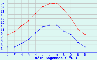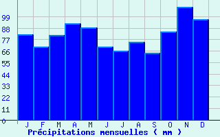 | Jan | Fev | Mars | Avr | Mai | Juin | Juil | Aout | Sept | Oct | Nov | Dec | Année | | Temp. max. (°C) | 8 | 9.7 | 13.1 | 15.7 | 19.6 | 23.5 | 24.9 | 25.3 | 21.7 | 17.3 | 11 | 8.2 | 16.5 | | Temp. moy. (°C) | 4.7 | 5.6 | 8.3 | 10.6 | 14.3 | 17.9 | 19.2 | 19.3 | 15.9 | 12.8 | 7.4 | 4.8 | 11.8 | | Temp. min. (°C) | 1.4 | 1.4 | 3.5 | 5.5 | 9.1 | 12.3 | 13.4 | 13.3 | 10.1 | 8.3 | 3.9 | 1.5 | 7 | | Jan | Fev | Mars | Avr | Mai | Juin | Juil | Aout | Sept | Oct | Nov | Dec | Année | | Jours Tx > 30°C | 0 | 0 | 0 | 0 | 0.3 | 2.7 | 4.1 | 5.1 | 0.6 | 0 | 0 | 0 | 12.8 | | Jours Tx > 25°C | 0 | 0 | 0.1 | 0.6 | 4.6 | 11.1 | 15.4 | 14.3 | 6.7 | 1.1 | 0 | 0 | 54 | | Jours Tx < 0°C | 1.5 | 0.5 | 0.1 | 0 | 0 | 0 | 0 | 0 | 0 | 0 | 0.1 | 1.5 | 3.6 | | Jours Tn < 0°C | 12.7 | 11.4 | 6.4 | 1.6 | 0.2 | 0 | 0 | 0 | 0 | 1.7 | 6.4 | 12.1 | 52.4 | | Jours Tn < -5°C | 3.3 | 2 | 0.6 | 0 | 0 | 0 | 0 | 0 | 0 | 0 | 0.7 | 3.2 | 9.7 | | Jours Tn < -10°C | 0.1 | 0 | 0.1 | 0 | 0 | 0 | 0 | 0 | 0 | 0 | 0 | 0.4 | 0.7 | | | | Jan | Fev | Mars | Avr | Mai | Juin | Juil | Aout | Sept | Oct | Nov | Dec | Année | | RR mensuel (mm) | 81.8 | 69.8 | 81.5 | 92.4 | 88.2 | 70.1 | 66.2 | 74.5 | 64 | 84.4 | 108.5 | 96.2 | 977.6 | | Jan | Fev | Mars | Avr | Mai | Juin | Juil | Aout | Sept | Oct | Nov | Dec | Année | | Jours RR > 1mm | 12.8 | 11 | 11.2 | 13 | 11.7 | 8.7 | 9.5 | 9.8 | 8.7 | 11.7 | 15.1 | 12.7 | 135.9 | | Jours RR > 5mm | 5.2 | 4.6 | 6 | 7.1 | 5.5 | 4.6 | 4.3 | 4.7 | 4.3 | 5.6 | 6.9 | 7.1 | 66 | | Jours RR > 10mm | 2.2 | 2 | 2.4 | 2.8 | 2.6 | 2.3 | 2.4 | 2.5 | 1.9 | 2.5 | 3.9 | 3.1 | 30.6 | | | | Jan | Fev | Mars | Avr | Mai | Juin | Juil | Aout | Sept | Oct | Nov | Dec | Année | | Vent moyen (km/h) | 10.8 | 11.5 | 11.5 | 10.8 | 9.7 | 9 | 9.4 | 8.3 | 8.6 | 9 | 9.7 | 10.4 | 9.7 | | Jan | Fev | Mars | Avr | Mai | Juin | Juil | Aout | Sept | Oct | Nov | Dec | Année | | Jours rafales >= 58km/h | 2.9 | 3.4 | 2.6 | 2.4 | 1 | 0.6 | 1.2 | 0.8 | 0.7 | 1.5 | 2 | 2.5 | 21.6 | | Jours rafales >= 100km/h | 0 | 0.1 | 0 | 0 | 0 | 0 | 0.1 | 0 | 0 | 0 | 0 | 0.1 | 0.2 |