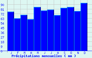 | Jan | Fev | Mars | Avr | Mai | Juin | Juil | Aout | Sept | Oct | Nov | Dec | Année | | Temp. max. (°C) | 4.4 | 6.2 | 10.6 | 14.6 | 19 | 22.3 | 24.8 | 24.3 | 20 | 15.1 | 8.7 | 5.2 | 14.6 | | Temp. moy. (°C) | 1.4 | 2.3 | 5.8 | 8.9 | 13.2 | 16.5 | 18.6 | 18.1 | 14.4 | 10.5 | 5.3 | 2.4 | 9.8 | | Temp. min. (°C) | -1.7 | -1.6 | 1.1 | 3.1 | 7.4 | 10.6 | 12.5 | 12 | 8.8 | 5.9 | 1.9 | -0.4 | 5 | | Jan | Fev | Mars | Avr | Mai | Juin | Juil | Aout | Sept | Oct | Nov | Dec | Année | | Jours Tx > 30°C | 0 | 0 | 0 | 0 | 0.1 | 1.6 | 4.5 | 3.1 | 0.1 | 0 | 0 | 0 | 9.5 | | Jours Tx > 25°C | 0 | 0 | 0 | 0.7 | 4 | 9.6 | 14.9 | 13.9 | 4.3 | 0.3 | 0 | 0 | 47.7 | | Jours Tx < 0°C | 5.7 | 3.3 | 0.2 | 0 | 0 | 0 | 0 | 0 | 0 | 0 | 1.1 | 3.8 | 14.2 | | Jours Tn < 0°C | 18.3 | 17.9 | 13.1 | 6.9 | 0.8 | 0 | 0 | 0 | 0.2 | 3.5 | 10.7 | 16.5 | 87.9 | | Jours Tn < -5°C | 7.8 | 6.5 | 2.6 | 0.3 | 0 | 0 | 0 | 0 | 0 | 0.2 | 2.2 | 5.1 | 24.7 | | Jours Tn < -10°C | 2.8 | 1.4 | 0.2 | 0 | 0 | 0 | 0 | 0 | 0 | 0 | 0.4 | 1.2 | 6 | | | | Jan | Fev | Mars | Avr | Mai | Juin | Juil | Aout | Sept | Oct | Nov | Dec | Année | | RR mensuel (mm) | 76 | 63 | 69.6 | 61 | 84.8 | 78.2 | 79.4 | 69.1 | 83.1 | 84.6 | 76.6 | 92.9 | 918.3 | | Jan | Fev | Mars | Avr | Mai | Juin | Juil | Aout | Sept | Oct | Nov | Dec | Année | | Jours RR > 1mm | 12.8 | 10.8 | 12.5 | 10.4 | 12.4 | 11 | 10.6 | 10.2 | 9.4 | 12.2 | 12.2 | 13.4 | 138 | | Jours RR > 5mm | 5.5 | 4.7 | 4.6 | 4.2 | 5.8 | 5.4 | 5.4 | 4.8 | 5.2 | 5.5 | 5.2 | 6.6 | 62.9 | | Jours RR > 10mm | 2.2 | 1.6 | 1.9 | 1.6 | 2.6 | 2.4 | 2.4 | 2.4 | 2.5 | 2.5 | 2 | 2.9 | 27.1 | | | | Jan | Fev | Mars | Avr | Mai | Juin | Juil | Aout | Sept | Oct | Nov | Dec | Année | | Vent moyen (km/h) | 10.4 | 10.1 | 10.1 | -- | 8.6 | 7.6 | 7.2 | 6.8 | 7.2 | 7.9 | 8.6 | 10.4 | -- | | Jan | Fev | Mars | Avr | Mai | Juin | Juil | Aout | Sept | Oct | Nov | Dec | Année | | Jours rafales >= 58km/h | -- | 3.9 | 3.1 | -- | -- | 1.3 | 1.2 | 0.7 | -- | 2.2 | 2.9 | -- | -- | | Jours rafales >= 100km/h | -- | 0.1 | 0 | -- | -- | 0 | 0 | 0.1 | -- | 0 | 0 | -- | -- |