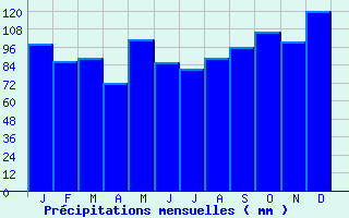 | Jan | Fev | Mars | Avr | Mai | Juin | Juil | Aout | Sept | Oct | Nov | Dec | Année | | Temp. max. (°C) | 3.8 | 5.7 | 10.3 | 14.3 | 18.8 | 22.1 | 24.5 | 24.2 | 19.6 | 14.6 | 8.1 | 4.5 | 14.3 | | Temp. moy. (°C) | 1.2 | 2.3 | 6.1 | 9.4 | 13.8 | 16.9 | 19.2 | 18.9 | 15 | 10.7 | 5.2 | 2.1 | 10.1 | | Temp. min. (°C) | -1.5 | -1.1 | 1.9 | 4.6 | 8.7 | 11.7 | 13.8 | 13.6 | 10.3 | 6.9 | 2.3 | -0.4 | 5.9 | | Jan | Fev | Mars | Avr | Mai | Juin | Juil | Aout | Sept | Oct | Nov | Dec | Année | | Jours Tx > 30°C | 0 | 0 | 0 | 0 | 0.1 | 1.4 | 4.1 | 3.2 | 0.1 | 0 | 0 | 0 | 9 | | Jours Tx > 25°C | 0 | 0 | 0.1 | 0.6 | 3.6 | 9.6 | 14.9 | 13.8 | 3.8 | 0.3 | 0 | 0 | 46.6 | | Jours Tx < 0°C | 7 | 3.8 | 0.3 | 0 | 0 | 0 | 0 | 0 | 0 | 0 | 1.4 | 5.1 | 17.6 | | Jours Tn < 0°C | 19 | 16.4 | 10.1 | 2.8 | 0 | 0 | 0 | 0 | 0 | 1.2 | 8.6 | 16.9 | 75.1 | | Jours Tn < -5°C | 6.9 | 5.3 | 1.2 | 0.1 | 0 | 0 | 0 | 0 | 0 | 0 | 1.2 | 4.1 | 18.7 | | Jours Tn < -10°C | 1.4 | 0.7 | 0.1 | 0 | 0 | 0 | 0 | 0 | 0 | 0 | 0.1 | 0.5 | 2.8 | | | | Jan | Fev | Mars | Avr | Mai | Juin | Juil | Aout | Sept | Oct | Nov | Dec | Année | | RR mensuel (mm) | 97.6 | 86.6 | 88.7 | 71.8 | 100.9 | 85.7 | 81.4 | 88.1 | 96 | 106 | 99.4 | 120.1 | 1122.3 | | Jan | Fev | Mars | Avr | Mai | Juin | Juil | Aout | Sept | Oct | Nov | Dec | Année | | Jours RR > 1mm | 12.3 | 11.1 | 12.3 | 10.8 | 13 | 11 | 10.4 | 10.6 | 9.8 | 11.9 | 12.2 | 13.4 | 138.9 | | Jours RR > 5mm | 6.7 | 6 | 6 | 5.1 | 6.9 | 5.7 | 5.8 | 5.6 | 6 | 6.8 | 6.5 | 7.9 | 75 | | Jours RR > 10mm | 3.1 | 2.9 | 2.7 | 2.3 | 3.3 | 3.1 | 2.8 | 3 | 3.2 | 3.6 | 3.2 | 4.5 | 37.7 | | | | Jan | Fev | Mars | Avr | Mai | Juin | Juil | Aout | Sept | Oct | Nov | Dec | Année | | Vent moyen (km/h) | 10.1 | 9.7 | 10.1 | 9 | 7.9 | 7.9 | 7.6 | 7.2 | 7.2 | 7.9 | 8.3 | 9.7 | 8.6 | | Jan | Fev | Mars | Avr | Mai | Juin | Juil | Aout | Sept | Oct | Nov | Dec | Année | | Jours rafales >= 58km/h | -- | 4.3 | 4.4 | 2.7 | -- | -- | 1.8 | -- | 1.5 | 2.6 | 2.4 | -- | -- | | Jours rafales >= 100km/h | -- | 0.2 | 0.1 | 0 | -- | -- | 0 | -- | 0 | 0.1 | 0.1 | -- | -- | | | | Jan | Fev | Mars | Avr | Mai | Juin | Juil | Aout | Sept | Oct | Nov | Dec | Année | | Jours avec brouillard (*) | 6.3 | 3.7 | 1.7 | 1.5 | 1.5 | 0.8 | 0.8 | 1.1 | 3.3 | 6 | 6 | 5.7 | 38.3 | | Jours avec orage (*) | 0.3 | 0.2 | 0.4 | 1.6 | 4.4 | 5.6 | 6.2 | 5.2 | 2.2 | 0.9 | 0.1 | 0.3 | 27.4 | | Jours avec grêle (*) | 0.1 | 0.1 | 0.3 | 0.2 | 0.3 | 0.2 | 0.1 | 0.1 | 0.1 | 0.1 | 0 | 0 | 1.7 | | Jours avec neige (*) | 7.2 | 7.9 | 4.9 | 1.7 | 0.1 | 0 | 0 | 0 | 0 | 0.2 | 2.8 | 6.7 | 31.3 |