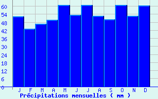 | Jan | Fev | Mars | Avr | Mai | Juin | Juil | Aout | Sept | Oct | Nov | Dec | Année | | Temp. max. (°C) | 7.4 | 8.9 | 13.1 | 16.8 | 20.7 | 23.8 | 26.5 | 26.3 | 22.3 | 17.1 | 11.2 | 7.6 | 16.8 | | Temp. moy. (°C) | 4.7 | 5.5 | 8.8 | 11.6 | 15.4 | 18.5 | 20.8 | 20.5 | 17.1 | 12.9 | 8.1 | 5.2 | 12.5 | | Temp. min. (°C) | 2.1 | 2.1 | 4.5 | 6.4 | 10.1 | 13.1 | 15.1 | 14.8 | 11.8 | 8.8 | 5 | 2.7 | 8.1 | | Jan | Fev | Mars | Avr | Mai | Juin | Juil | Aout | Sept | Oct | Nov | Dec | Année | | Jours Tx > 30°C | 0 | 0 | 0 | 0 | 0.7 | 3.1 | 7.4 | 6.4 | 1.3 | 0 | 0 | 0 | 19 | | Jours Tx > 25°C | 0 | 0 | 0 | 1.6 | 6.7 | 12.1 | 18.7 | 17.9 | 6.9 | 1.1 | 0 | 0 | 65 | | Jours Tx < 0°C | 1.8 | 0.6 | 0 | 0 | 0 | 0 | 0 | 0 | 0 | 0 | 0.2 | 0.5 | 3.1 | | Jours Tn < 0°C | 9.8 | 9 | 4.1 | 0.8 | 0 | 0 | 0 | 0 | 0 | 0.3 | 3.9 | 8.9 | 36.8 | | Jours Tn < -5°C | 2.3 | 1.4 | 0.1 | 0 | 0 | 0 | 0 | 0 | 0 | 0 | 0.4 | 0.8 | 4.9 | | Jours Tn < -10°C | 0.4 | 0.1 | 0 | 0 | 0 | 0 | 0 | 0 | 0 | 0 | 0 | 0 | 0.5 | | | | Jan | Fev | Mars | Avr | Mai | Juin | Juil | Aout | Sept | Oct | Nov | Dec | Année | | RR mensuel (mm) | 52.2 | 43.2 | 46.6 | 49.6 | 60.8 | 53.3 | 61 | 52.7 | 50.1 | 60.7 | 52.7 | 60.3 | 643.2 | | Jan | Fev | Mars | Avr | Mai | Juin | Juil | Aout | Sept | Oct | Nov | Dec | Année | | Jours RR > 1mm | 10.6 | 9.5 | 10.5 | 9.4 | 10.3 | 8.4 | 7.8 | 7.8 | 8.3 | 9.9 | 10.3 | 11.3 | 114.1 | | Jours RR > 5mm | 3.7 | 2.6 | 3.2 | 3.4 | 4.3 | 3.8 | 3.5 | 3 | 3.6 | 4 | 3.7 | 4.4 | 43.2 | | Jours RR > 10mm | 0.9 | 0.8 | 0.7 | 1.3 | 1.7 | 1.5 | 1.6 | 1.4 | 1.4 | 1.9 | 1.1 | 1.4 | 15.7 | | | | Jan | Fev | Mars | Avr | Mai | Juin | Juil | Aout | Sept | Oct | Nov | Dec | Année | | Vent moyen (km/h) | 13 | 13.3 | 13 | 12.2 | 11.5 | 11.2 | 11.2 | 10.1 | 10.4 | 10.8 | 11.5 | 12.6 | 11.9 | | Jan | Fev | Mars | Avr | Mai | Juin | Juil | Aout | Sept | Oct | Nov | Dec | Année | | Jours rafales >= 58km/h | 6.5 | 6.4 | 6.4 | 4.3 | 3.2 | 2.2 | -- | -- | -- | -- | 3.9 | -- | -- | | Jours rafales >= 100km/h | 0.2 | 0.2 | 0.1 | 0.1 | 0 | 0 | -- | -- | -- | -- | 0 | -- | -- |