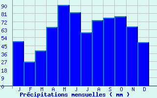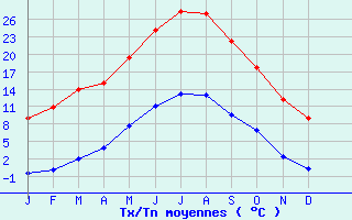 | Jan | Fev | Mars | Avr | Mai | Juin | Juil | Aout | Sept | Oct | Nov | Dec | Année | | Temp. max. (°C) | 8.9 | 10.9 | 13.9 | 15.1 | 19.5 | 24.2 | 27.5 | 27.1 | 22.3 | 17.7 | 12.2 | 8.9 | 17.4 | | Temp. moy. (°C) | 4.2 | 5.5 | 8 | 9.5 | 13.5 | 17.6 | 20.3 | 20 | 16 | 12.3 | 7.3 | 4.6 | 11.6 | | Temp. min. (°C) | -0.5 | 0 | 2 | 3.9 | 7.6 | 11 | 13.2 | 13 | 9.6 | 6.9 | 2.4 | 0.3 | 5.8 | | Jan | Fev | Mars | Avr | Mai | Juin | Juil | Aout | Sept | Oct | Nov | Dec | Année | | Jours Tx > 30°C | 0 | 0 | 0 | 0 | 0.4 | 2.9 | 8 | 7.7 | 0.6 | 0 | 0 | 0 | 19.6 | | Jours Tx > 25°C | 0 | 0 | 0.1 | 0.2 | 3.9 | 15.4 | 24 | 22.5 | 8.4 | 1.2 | 0 | 0 | 75.5 | | Jours Tx < 0°C | 0.5 | 0.5 | 0.3 | 0.1 | 0 | 0 | 0 | 0 | 0 | 0 | 0.1 | 0.2 | 1.5 | | Jours Tn < 0°C | 17.4 | 12.8 | 7.5 | 2.5 | 0 | 0 | 0 | 0 | 0 | 0.5 | 6.7 | 14.1 | 61.5 | | Jours Tn < -5°C | 2 | 2.3 | 0.8 | 0.1 | 0 | 0 | 0 | 0 | 0 | 0 | 0.7 | 1.8 | 7.6 | | Jours Tn < -10°C | 0.1 | 0.1 | 0.1 | 0 | 0 | 0 | 0 | 0 | 0 | 0 | 0 | 0 | 0.2 | | | | Jan | Fev | Mars | Avr | Mai | Juin | Juil | Aout | Sept | Oct | Nov | Dec | Année | | RR mensuel (mm) | 49.8 | 26.8 | 39.2 | 65.9 | 90.7 | 82.3 | 59.4 | 73.6 | 76.2 | 78 | 66.1 | 48.7 | 756.7 | | Jan | Fev | Mars | Avr | Mai | Juin | Juil | Aout | Sept | Oct | Nov | Dec | Année | | Jours RR > 1mm | 6.5 | 4.7 | 6 | 9.1 | 10.4 | 8.6 | 7 | 7.3 | 7 | 7.2 | 6.3 | 5.8 | 85.9 | | Jours RR > 5mm | 3.1 | 1.4 | 2.9 | 4 | 5.6 | 4.9 | 3.4 | 4.2 | 3.8 | 4.1 | 3.3 | 3.1 | 43.7 | | Jours RR > 10mm | 1.6 | 0.7 | 0.8 | 2 | 3 | 2.6 | 2 | 2.5 | 2.4 | 2.4 | 2 | 1.5 | 23.5 | | | | Jan | Fev | Mars | Avr | Mai | Juin | Juil | Aout | Sept | Oct | Nov | Dec | Année | | Vent moyen (km/h) | 10.8 | 11.2 | 11.9 | 11.2 | 10.4 | 11.2 | 11.2 | 11.2 | 10.4 | 9.7 | 10.4 | 10.4 | 10.8 | | | | Jan | Fev | Mars | Avr | Mai | Juin | Juil | Aout | Sept | Oct | Nov | Dec | Année | | Ensoleillement (heures) | 122.4 | 155.7 | 186.7 | 170.9 | 189 | 222 | 254.2 | 230 | 190.7 | 157 | 131.1 | 99 | 2108.6 |